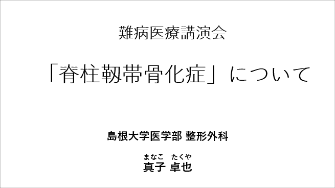 令和5年度 医療講演会をWEB配信形式で令和5年11月16日~12月15日に開催しました。 講演は「脊柱靭帯骨化症について」と題し、島根大学医学部整形外科教室 真子卓也先生に講演していただきました。 患者・家族をはじめ、保健師、ケアマネ等56名の参加があり、「難病の中でも比較的多い疾患だが、学習する機会がなかったので学べてよかった」「Web配信で、いつでも見られること、何度でも見られることが良かった」等の感想をいただきました。